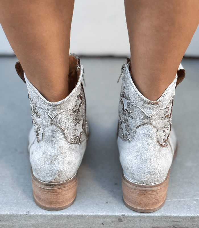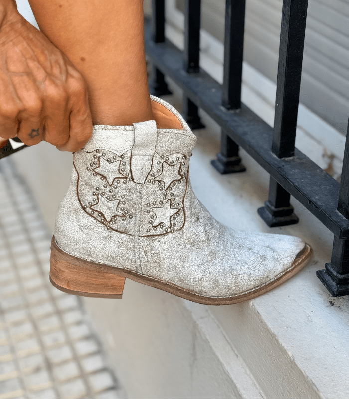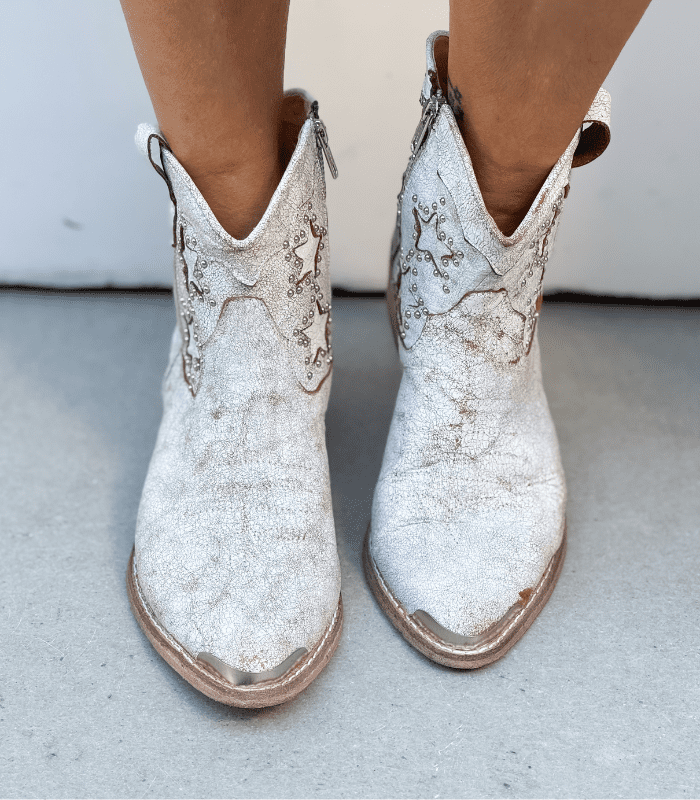 Cracked white leather with star-shaped details and studs.